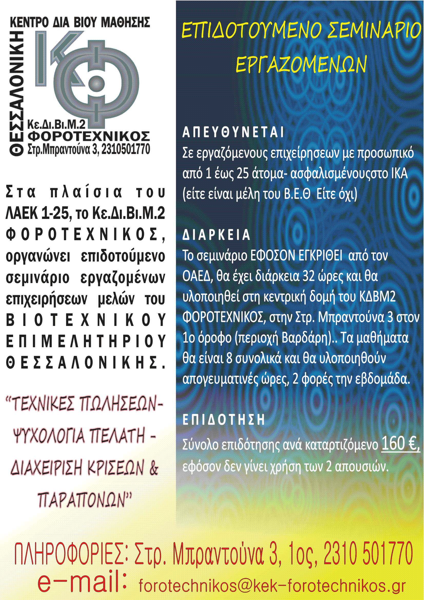 Σε συνεργασία με το ΒΙΟΤΕΧΝΙΚΟ ΕΠΙΜΕΛΗΤΗΡΙΟ ΘΕΣΣΑΛΟΝΙΚΗΣ, το ΚΔΒΜ2 ΦΟΡΟΤΕΧΝΙΚΟΣ συλλέγει αιτήσεις για το σεμινάριο με τίτλο: "ΤΕΧΝΙΚΕΣ ΠΩΛΗΣΕΩΝ-ΨΥΧΟΛΟΓΙΑ ΠΕΛΑΤΗ - ΔΙΑΧΕΙΡΙΣΗ ΚΡΙΣΕΩΝ & ΠΑΡΑΠΟΝΩΝ" .